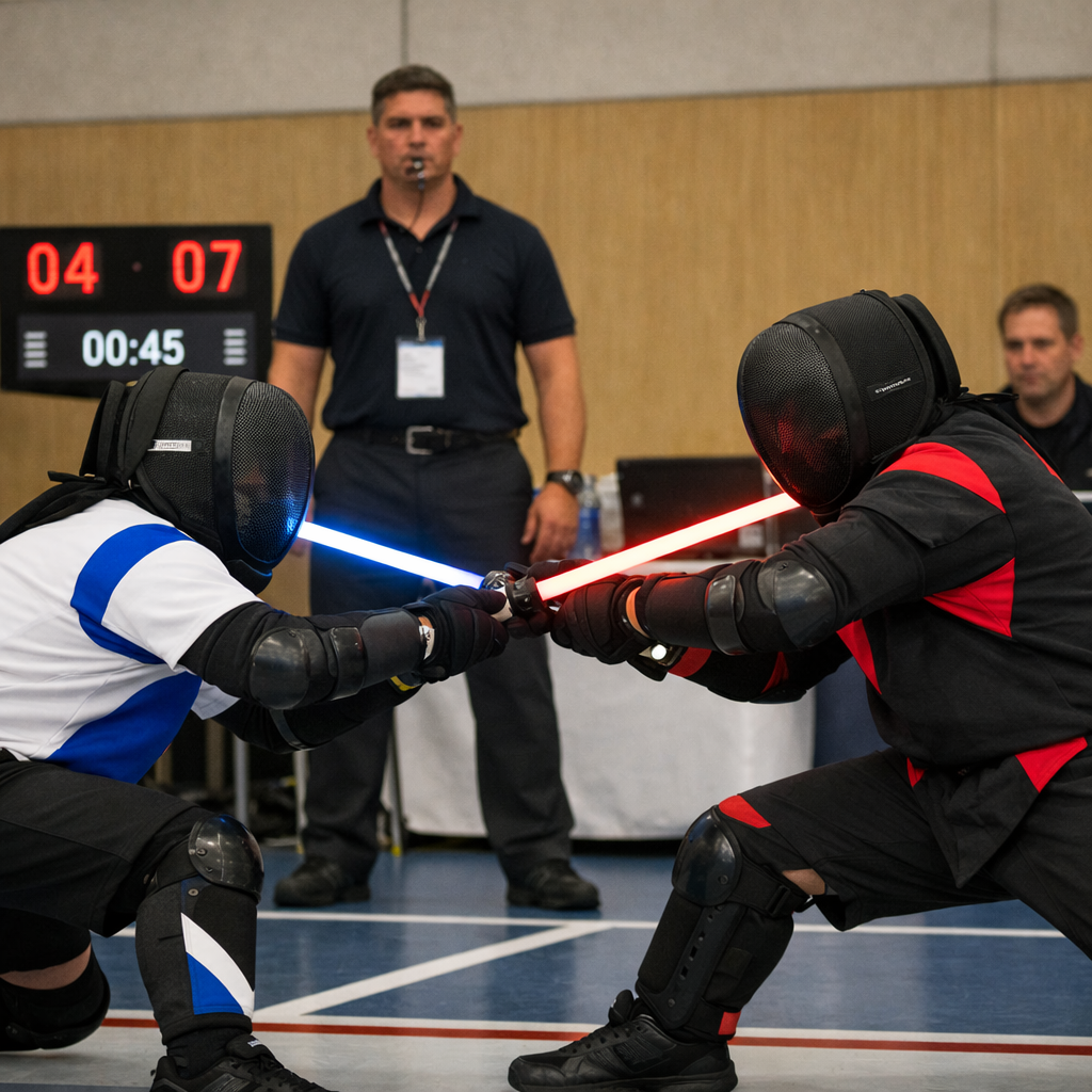 Discipline affiliée à la Fédération Française d’Escrime, elle permet d’avoir une approche ludique lors d’un duel.